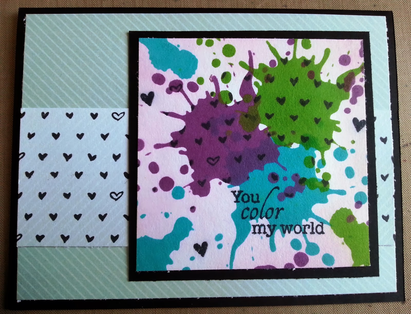 This card features stamping through a stencil. When I saw Kristina's card I had to have the splatter stencil from Tim Holtz so I popped in the my LSS to submit some cards for their contest and pick up this fabulous stencil. The various heart stamps are Lawn Fawn.