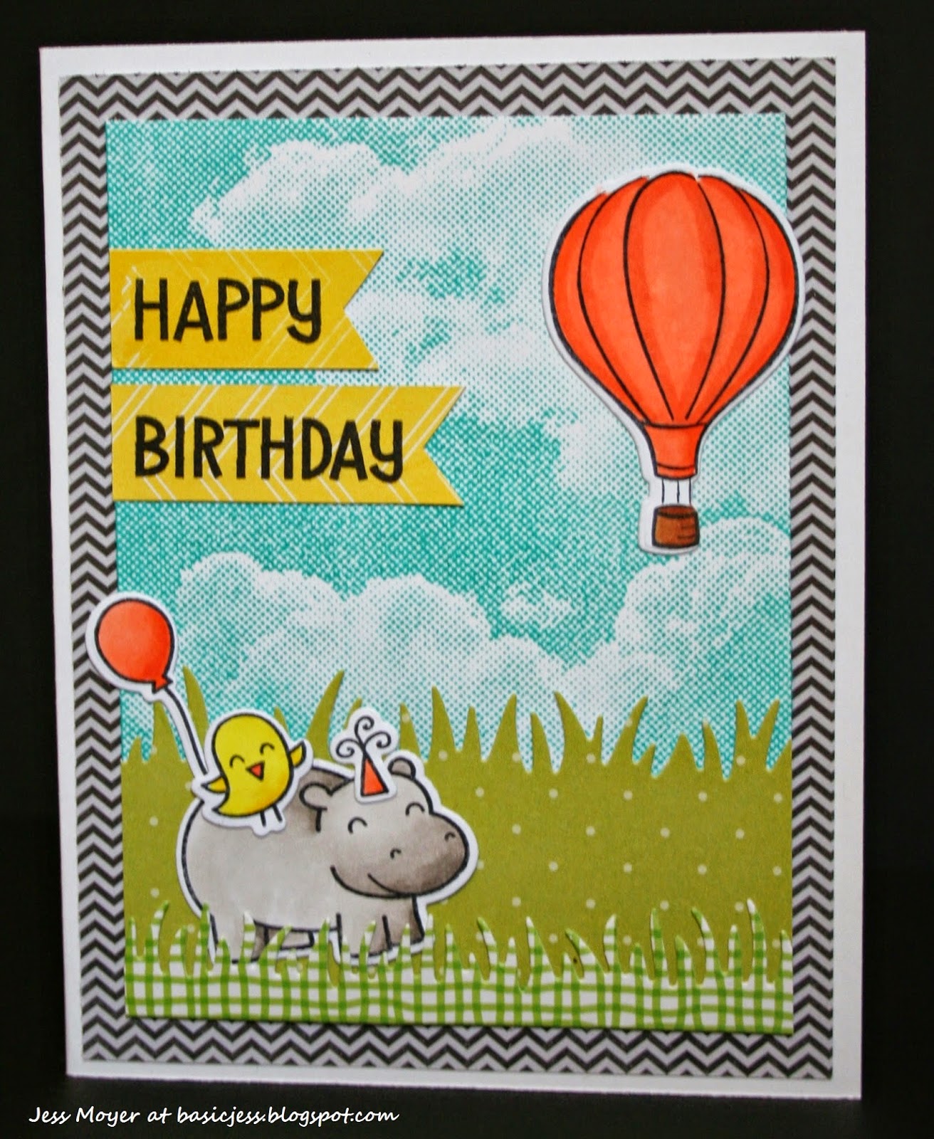 The Open-Minded Crafting Fun challenge blog's theme is Animal Antics. Which is perfect for these little cuties from Lawn Fawn. I created this card with lots of Lawn Fawn. I used the Grassy Borders die, Year Four stamp set and dies, Year Two stamp set, and Blue Skies stamp set and die. The coloring is done with Copics.