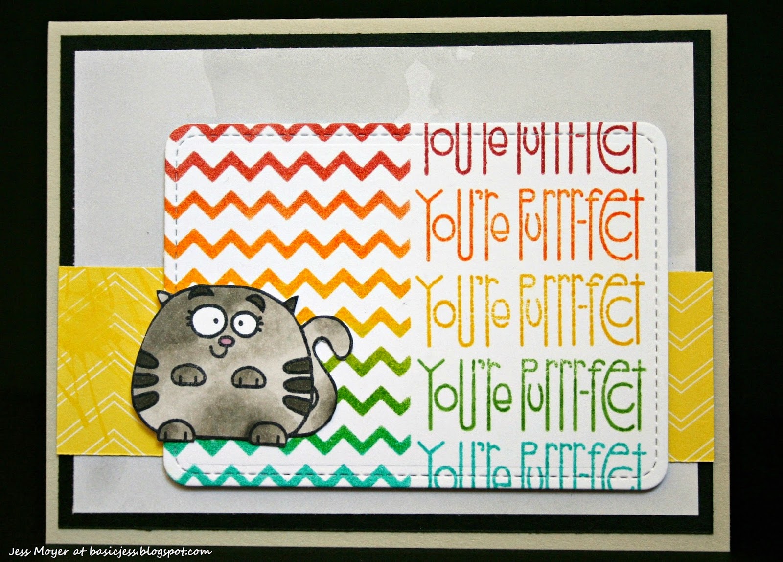 I've been a little obsessed with creating rainbows lately. I think it is because I want spring to be here so badly. The weather has still been flip flopping a bit, but Spring Break is on its way. Anyway I was inspired by the Keep It Simple challenge to use stencils and the Virginia's View stencil challenge. I used a Prima stencil and some Distress Inks to create the chevron pattern. I wanted to participate in the Paper Smooches SparksAnything Goes challenge so I picked a Paper Smooches sentiment and stamped it in the same colors. I stamped and colored the cat from Paper Smooches Chubby Chums with Copics. Then I fussy cut him and adhered him to accent the panel. I mounted it all on some simple background paper so the panel would really be the star. I'm also entering this into the Open-Minded Crafting Fun challenge Animal Antics. Now I know this is extremely similar to my last Paper Smooches card but sometimes after school I just want to play without thinking about it too much so I did a variation on a card I already loved. Give the rainbow coloring a try, maybe it will convince mother nature to bring on the spring! Oh and if you're in the market for some fabulous colored inks to try it with Blitzy has a great sale on Memento Luxe inks.